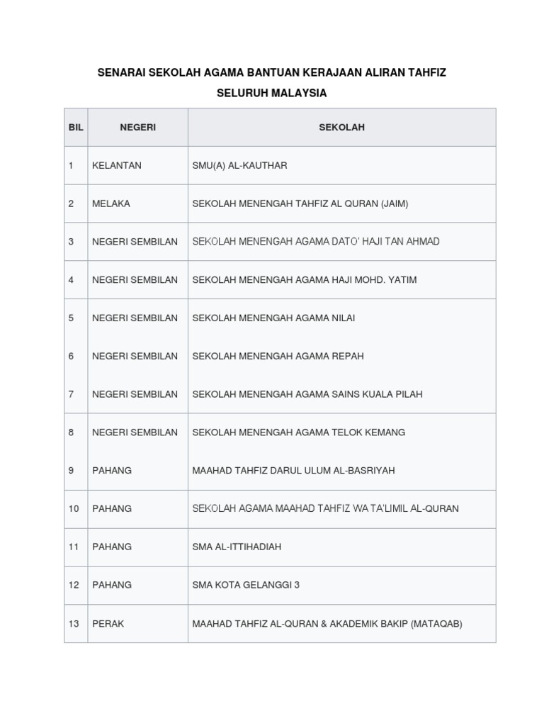 Senarai Sekolah Aliran Tahfiz Kerajaan Seluruh Malaysia Pdf